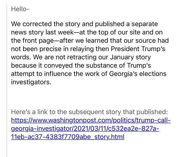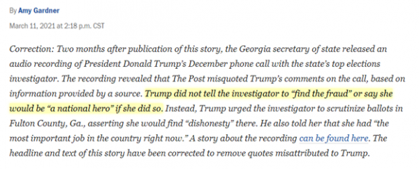 This Washington Post correction was necessitated by the release of an audio recording, which showed that Trump’s comments on the call were misquoted “based on information provided by a source.”