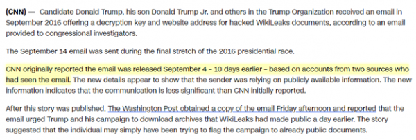 Back in December 2017, CNN reported that Trump Jr. received an email regarding a Wikileaks release on September 4, 2016. This date – 9/4/2016 – was material because it was 10 days before the Wikileaks release of the hacked DNC materials. CNN had its smoking gun. It had evidence that Trump Jr, and by extension the Trump Campaign, had advance notice of the hacked DNC documents. Until it didn’t.