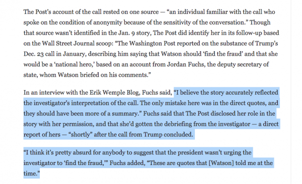 This isn’t the end of the story, however. There’s still a story and it’s a good one. It has to do with the anonymous source who lied about Trump’s call – potentially for political gain.