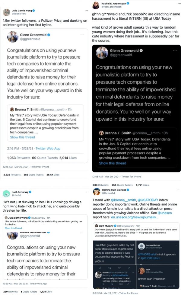 Sunday’s USA Today article which tried to destroy the ability of these criminal defendants to raise donations for their legal fees contained the names of three journalists in its byline. The lead reporter — the one who the paper’s editors put first, Brenna Smith — took to Twitter to boast of this monumental journalistic exposé. After I saw several commenters criticizing the story, I added my own critiques of this story: