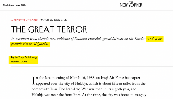 The classic case is Jeffrey Goldberg, who wrote one of the most deceitful and destructive articles of his generation: a lengthy New Yorker article in May, 2002 — right as the propagandistic groundwork for the invasion of Iraq was being laid — that claimed Saddam Hussein had formed an alliance with Al Qaeda and Osama bin Laden. In February, 2003, on the eve of the invasion of Iraq, NPR host Robert Siegel devoted a long segment to this claim. When he asked Goldberg about “a man named Abu Musab al-Zarqawi,” Goldberg replied: “He is one of several men who might personify a link between Iraq and al-Qaeda.”