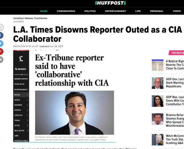 Another illustrative mascot for this lucrative career path is NBC‘s national security correspondent Ken Dilanian. In 2014, his own former paper, The Los Angeles Times, acknowledged his “collaborative” relationship with the CIA. During his stint there, he mimicked false claims from John Brennan’s CIA that no innocent people were killed from a 2012 Obama drone strike, only for human rights groups and leaked documents to prove many were.