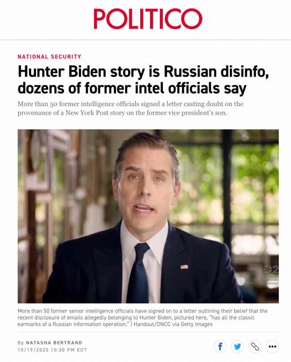 It was this Politico article by Bertrand that was then used by Facebook and Twitter to justify their joint censorship of the Post‘s reporting in the weeks before the 2020 election, and numerous media outlets — including The Intercept — gullibly told their readers to ignore the revelations on the ground that these authentic documents were “Russian disinformation.” Yet once it did its job of helping defeat Trump, that claim was debunked when even the intelligence community acknowledged it had no evidence of Russian involvement in the appearance of these materials, and Hunter Biden himself admitted he was the subject of a federal investigation for the transactions revealed by those documents.